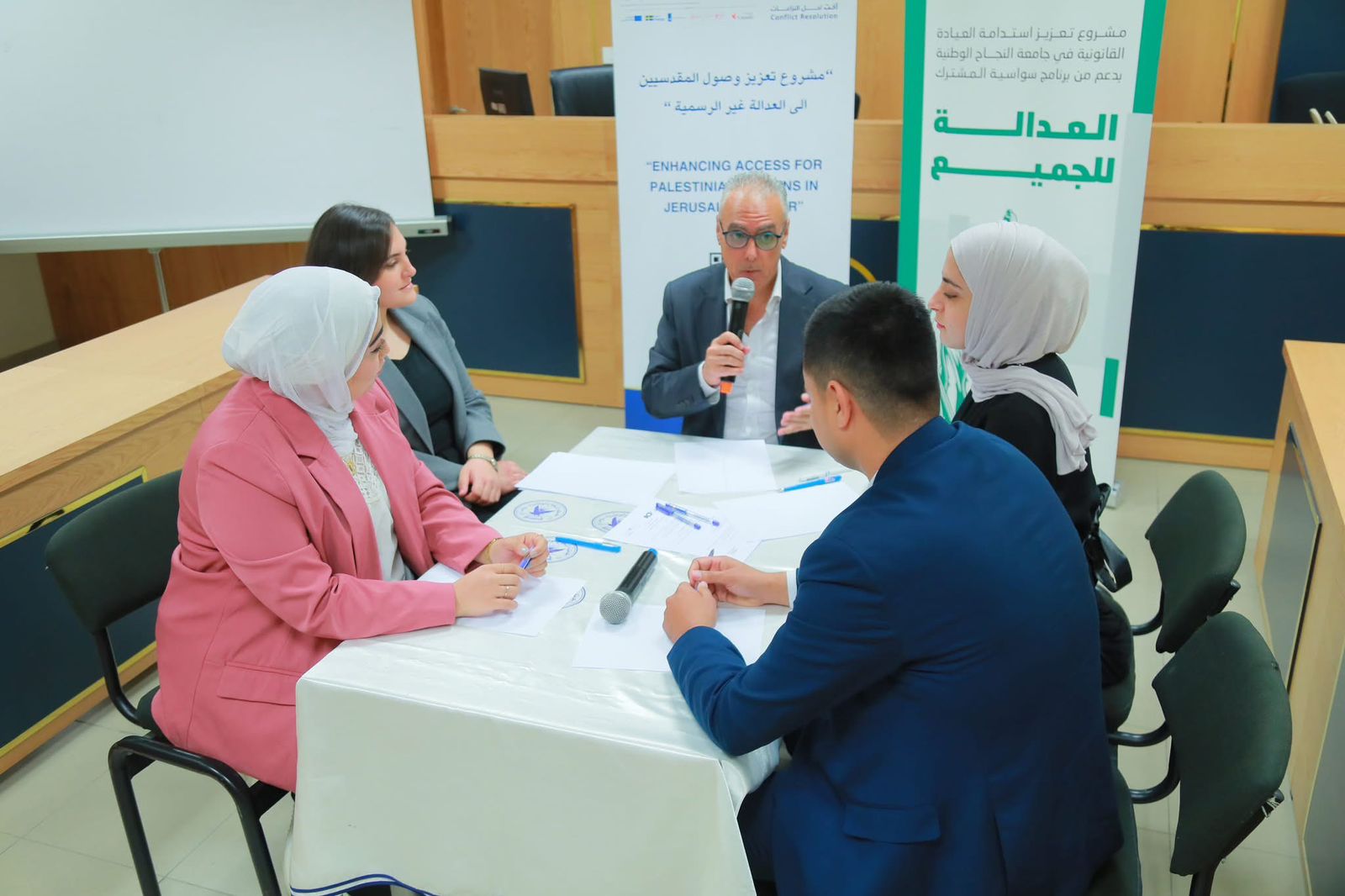 A Practical Experience Highlighting the Effectiveness of Alternative Dispute Resolution On Thursday, 30 October 2025, ACT for Conflict Resolution organized a mock mediation session in cooperation with the Legal Clinic at An-Najah National University, with support of the Sawasya III Joint Programme through UNDP PAPP, The session addressed a labor dispute between two parties and concluded with an amicable agreement, reflecting the essence of mediation as a tool based on dialogue, negotiation, and mutual interests. The session was attended by Mr. Mohammad Hadiyeh, Chairman of ACT’s Board of Directors, alongside the Legal Clinic team and a group of law students. This practical exercise came as a continuation of an earlier training process, as members of the Legal Clinic had received a specialized three-day training on the basics of mediation one month earlier, initiated by ACT as part of its community contribution to promoting the culture of mediation. Through this training, participants received hands-on skills in mediation, conflict management, and peaceful dispute resolution. The mock session offered students an opportunity to engage in a realistic simulation outside the traditional theoretical framework, enabling them to experience the role of the mediator, understand the stages and procedures of mediation, and practice managing effective dialogue between disputing parties. Students expressed great interest in the experience. One participant said: “This was our first participation in a practical mediation session, and we were surprised by how this method can reach fair solutions in a short time and away from judicial complications.” Another student added: “Today’s experience helped us realize the importance of mediation and the need to spread its culture in society, especially in labor disputes that may take years in court.” Several participants also emphasized their desire to join advanced mediation programs in the future, noting that the experience boosted their confidence in applying legal skills in a practical, real-world context. This session is part of a wider series of initiatives through which ACT seeks to promote the culture of mediation in Palestine and empower the younger generation with advanced tools to resolve conflicts fairly and constructively—contributing to a society grounded in dialogue and peaceful solutions.
