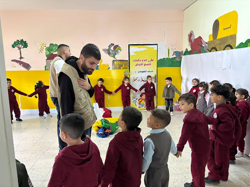 A psychosocial support activity for children was organized in collaboration with Nafas Foundation, the Rafat Municipality, and the Rafat Women’s Association. The activity aimed to provide emotional relief, promote mental well-being, and encourage positive social interaction among the children through engaging group exercises. In the photo, a large group of children is participating in a colorful team-building game, working together around a parachute-style cloth under the supervision of facilitators. The activity creates a joyful and supportive environment that helps children express themselves, release stress, and strengthen their sense of belonging within the community.